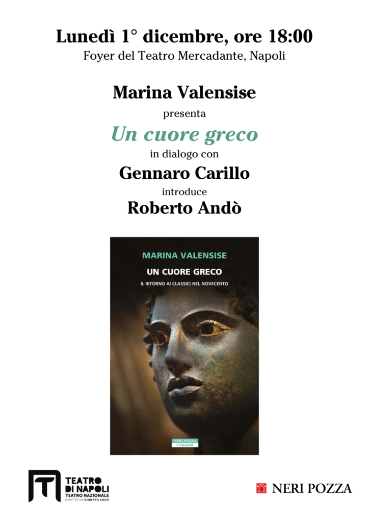 Il 1° dicembre alle ore 18:00, il Foyer del Teatro Mercadante di Napoli ospiterà la scrittrice e saggista Marina Valensise per la presentazione del suo nuovo libro, Un cuore greco, pubblicato da Neri Pozza, un viaggio affascinante attraverso il ritorno ai classici nel Novecento e il loro ruolo nel pensiero contemporaneo.