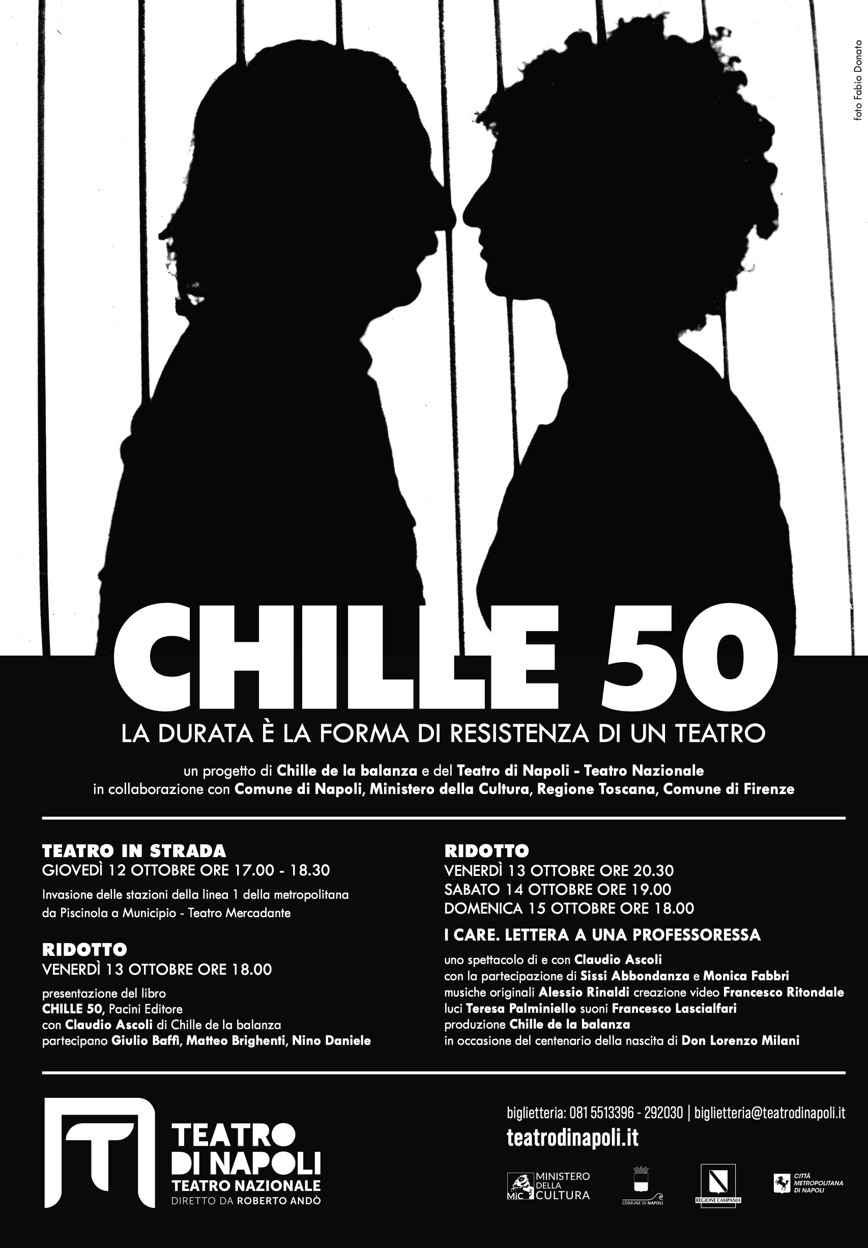 Il progetto CHILLE 50 si concluderà con la presentazione di uno degli spettacoli di culto dei Chille, la cui ultima edizione è stata l’elemento di punta del Festival I CARE. Don Milani 100, evento speciale dell’Estate fiorentina 2023, prodotto sempre dai Chille. Venerdì 13 ottobre alle 20.30, Sabato Il 14 ottobre alle ore 19.00 e il 15 ottobre alle ore 18.00 al Ridotto del Teatro Mercadante ecco “I CARE. Lettera a una professoressa”, prodotto in occasione del centenario della nascita di Don Lorenzo Milani. “I CARE” è uno spettacolo di e con Claudio Ascoli, con la partecipazione di Sissi Abbondanza e Monica Fabbri. Musiche originali di Alessio Rinaldi. Creazione video di Francesco Ritondale. Luci di Teresa Palminiello. Suoni di Francesco Lascialfari.  E’ uno spettacolo di coinvolgente creazione collettiva con il pubblico, così come la Lettera fu una creazione collettiva degli allievi di Barbiana con la regia di Don Milani. Tra i tanti commenti critici delle diverse edizioni dello spettacolo, segnaliamo: “Un atto d’amore” (Giuliano Scabia).” “Esibendo il suo corpo, il movimento delle mani… Ascoli sembrava volesse comunicarci qualcosa che non si può dire a parole, che dobbiamo cercare dentro noi stessi.” (Pietro Clemente). “Claudio Ascoli ha a cuore il racconto al pari di una ragione di vita, parla con profondità e leggerezza, come se ci fosse stato e avesse visto in prima persona” (Matteo Brighenti).