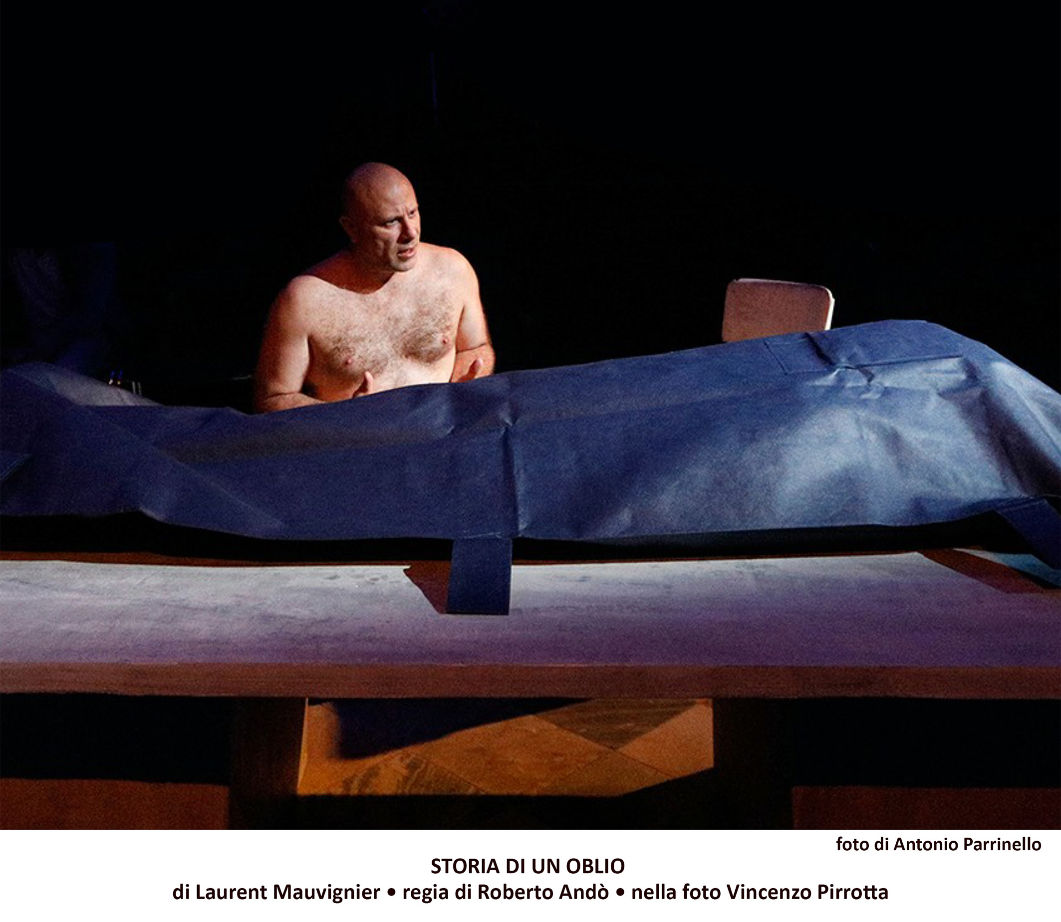 «Quando lessi il testo di Laurent Mauvignier – scrive Roberto Andò nelle allo spettacolo – ho pensato subito che era scritto in una lingua vocata al teatro. Storia di un oblio è un canto a più voci, ma è concepito per una sola voce. Un canto che Vincenzo Pirrotta intona a nome di ognuno di noi, conducendoci in quella zona dolorosa e opaca in cui ogni essere umano è destinato a sparire e a essere dimenticato. La scrittura di Mauvignier circoscrive luoghi indicibili dell’esperienza, quei luoghi della memoria o della coscienza che resistono alle parole. A questa resistenza Mauvignier contrappone l’esattezza della parola, il suo potere evocativo e catartico.