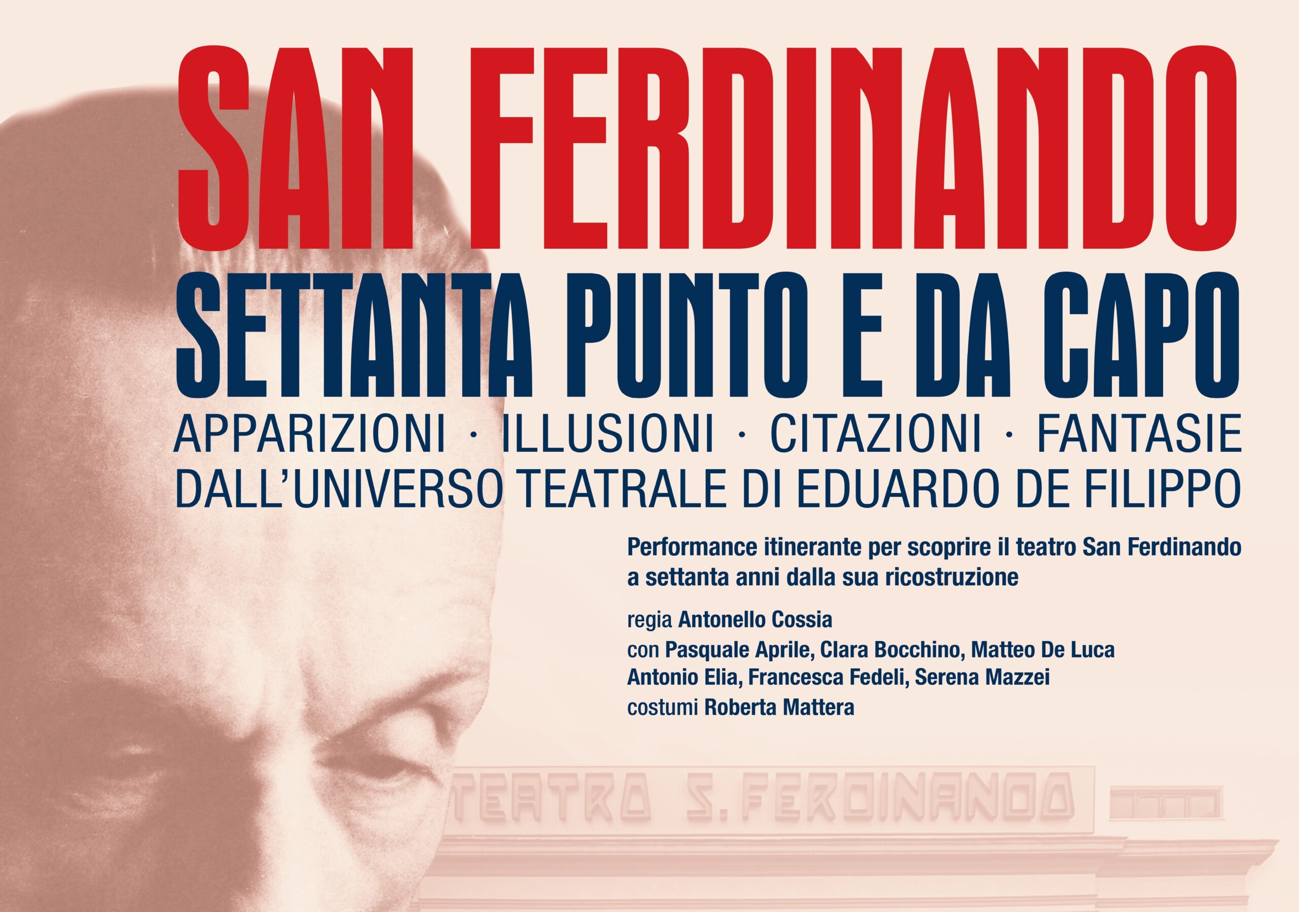 Parte sabato 2 e domenica 3 marzo, alle 11.00, il ciclo di Visite guidate “in forma di performance” dal titolo SAN FERDINANDO, SETTANTA PUNTO E DA CAPO, promosso dal Teatro di Napoli-Teatro Nazionale in collaborazione con la Fondazione Eduardo De Filippo, a cura di Artèpolis, realizzato nell’ambito delle manifestazioni per i 70 anni della riapertura dello storico teatro di Piazza Eduardo De Filippo 20.
