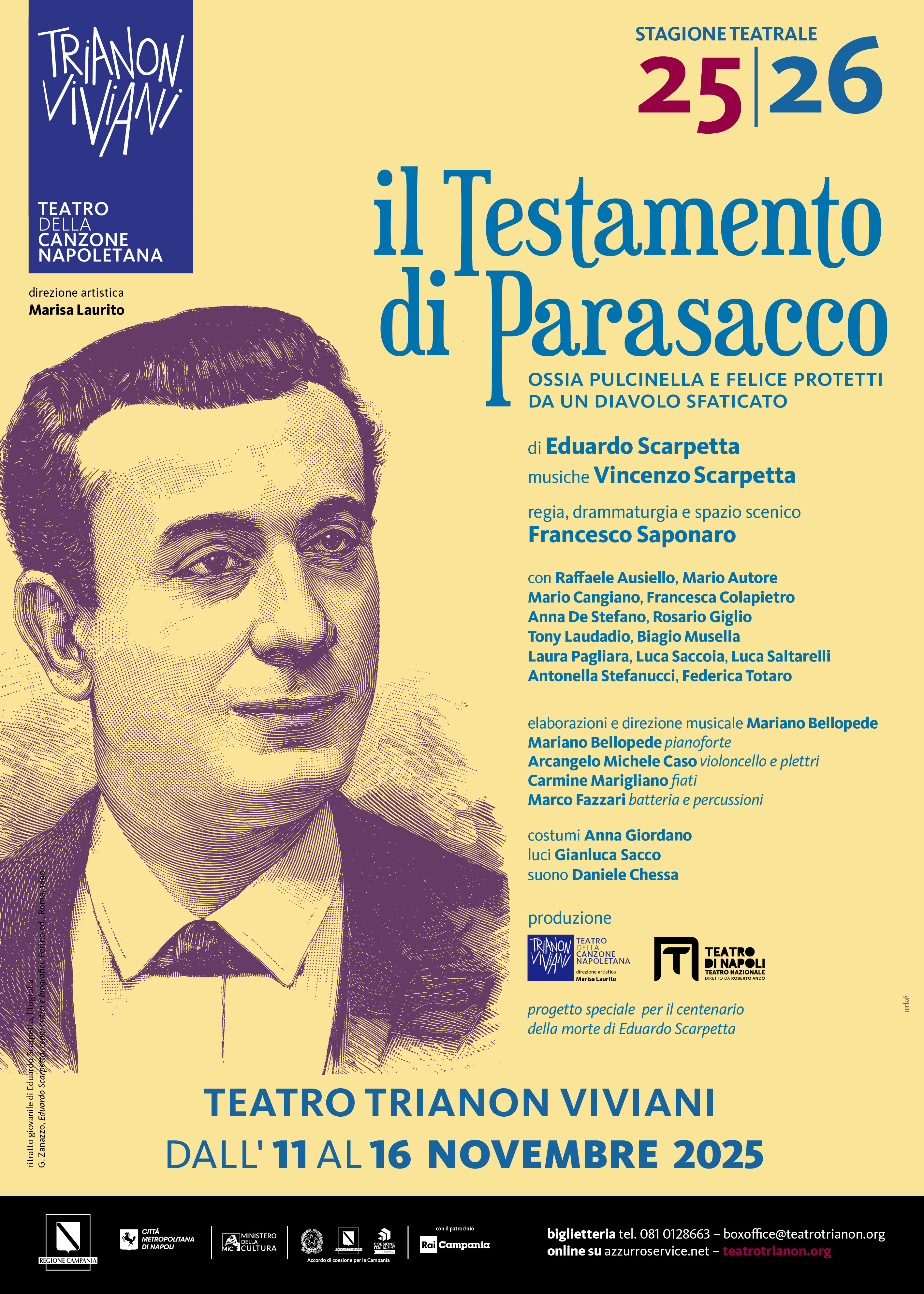 Lo Testamiento de Parasacco ossia Pulcinella e Sciosciammocca protetti da no Diavolo Sfaticato è una commedia comico – fantastica – spettacolosa in 3 atti di Eduardo Scarpetta. Si tratta di un gioiello di scrittura teatrale di quel genio pirotecnico che fu Scarpetta, magnifico patriarca del teatro napoletano, di cui nel 2025 ricorrono i cento anni dalla scomparsa.