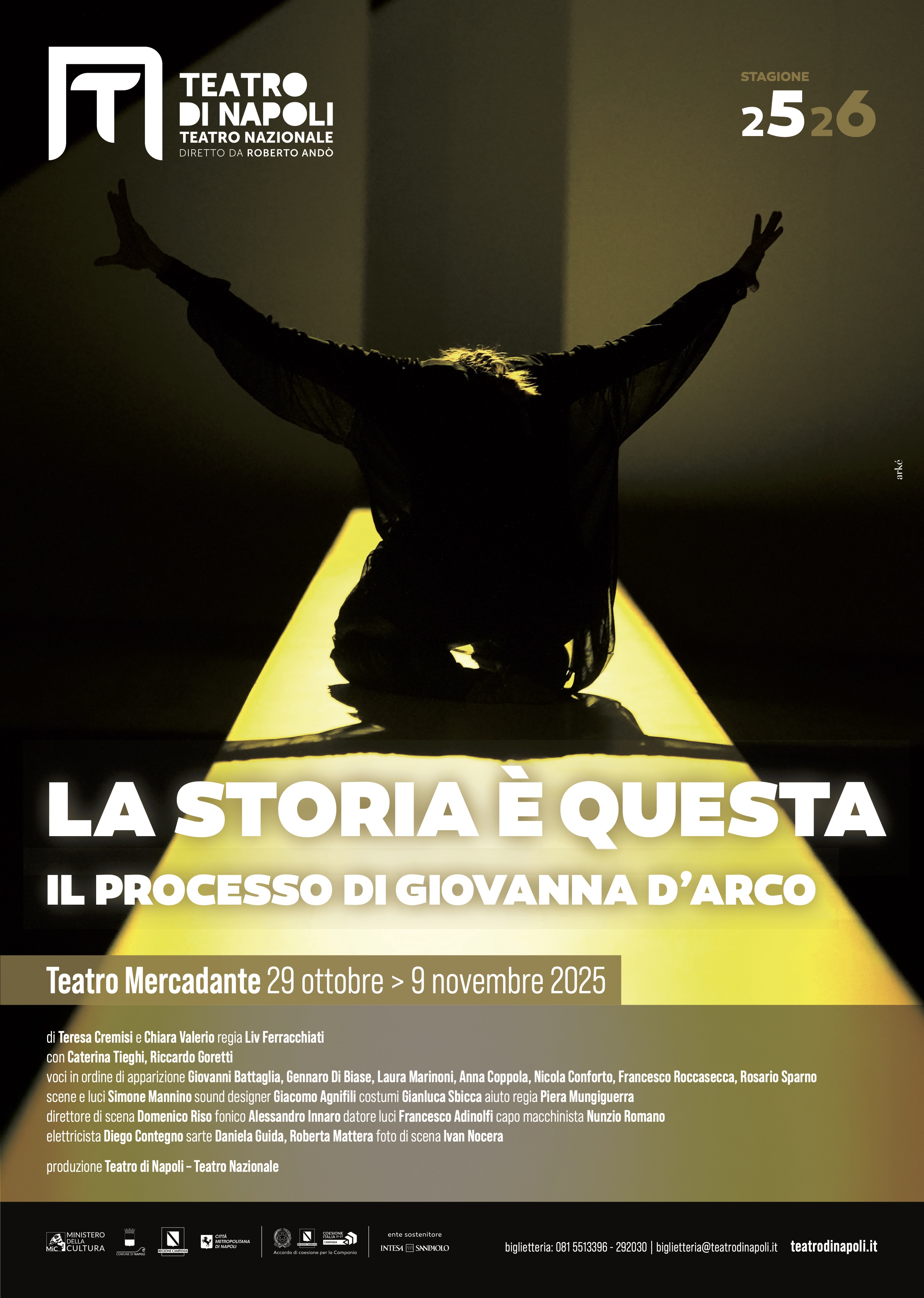 Tre voci autorevoli e originali del panorama culturale contemporaneo si incontrano in un progetto teatrale inedito: Teresa Cremisi e Chiara Valerio firmano la scrittura di uno spettacolo che porta la firma registica di Liv Ferracchiati. Giovanna sulla scena è sola nel momento dell’accusa e in quello successivo della condanna. Vicino a lei un anonimo cronista che racconta la sua vicenda. Quasi un’ombra che incarna la voce del popolo, lo stesso popolo che l’ha innalzata e ora l’abbandona, implacabile nel giudicarne la disfatta. Il carisma e il comando di Giovanna sono caduchi perché la logica del potere è semplice, stare lontano da ogni forma di sconfitta. Tutto intorno, in una zona liminare, fra luce e ombra, dentro e fuori dalla sua testa, stanno le voci imperiose, ironiche e ambigue dei santi che l’hanno accompagnata fin dall’infanzia. Di voce c’è anche quella più incalzante, maschile e materica del Giudice. Un uomo senza volto, ineluttabile come sempre è il potere, il cui corpo esiste solo nella violenza della condanna.