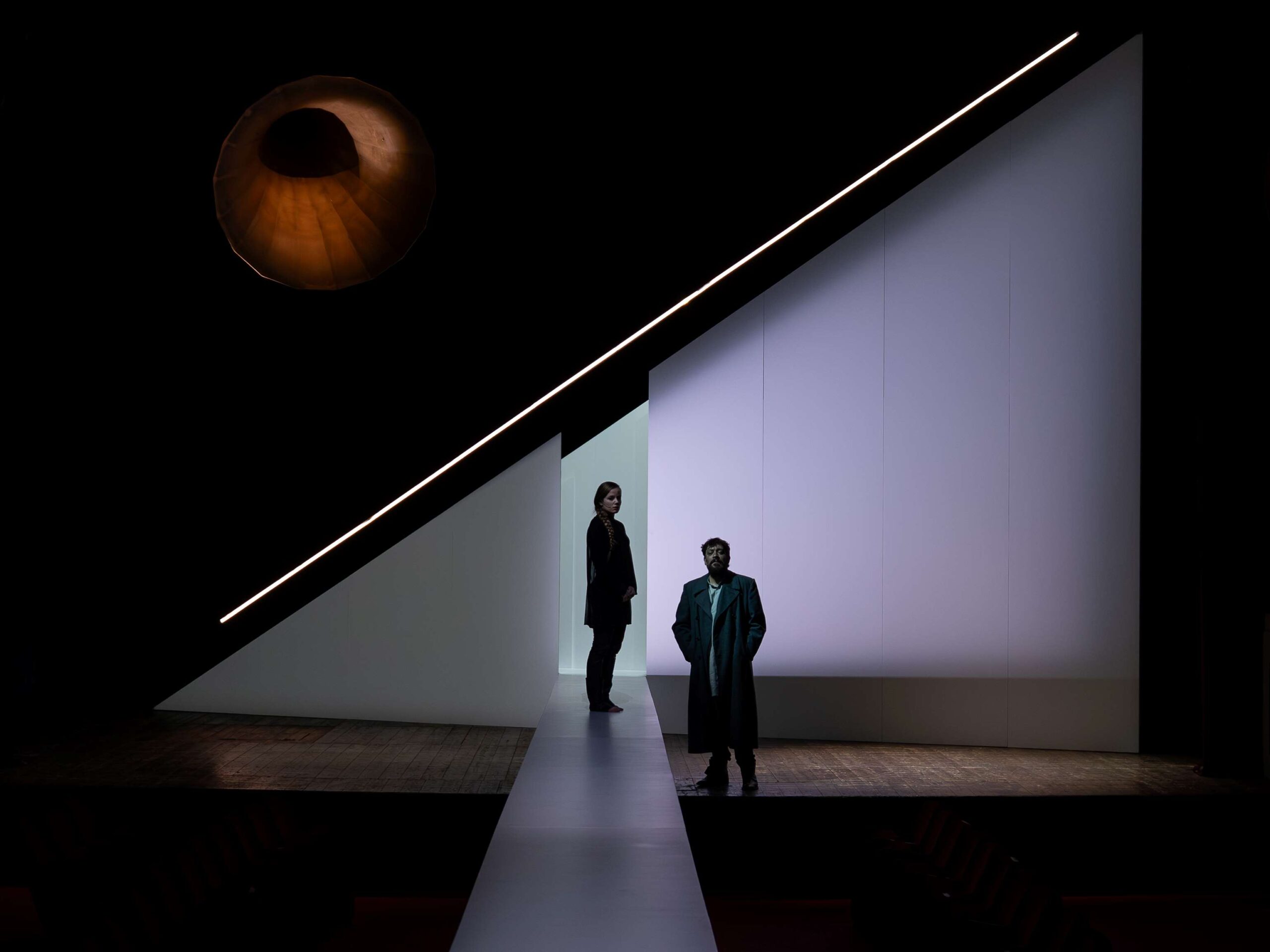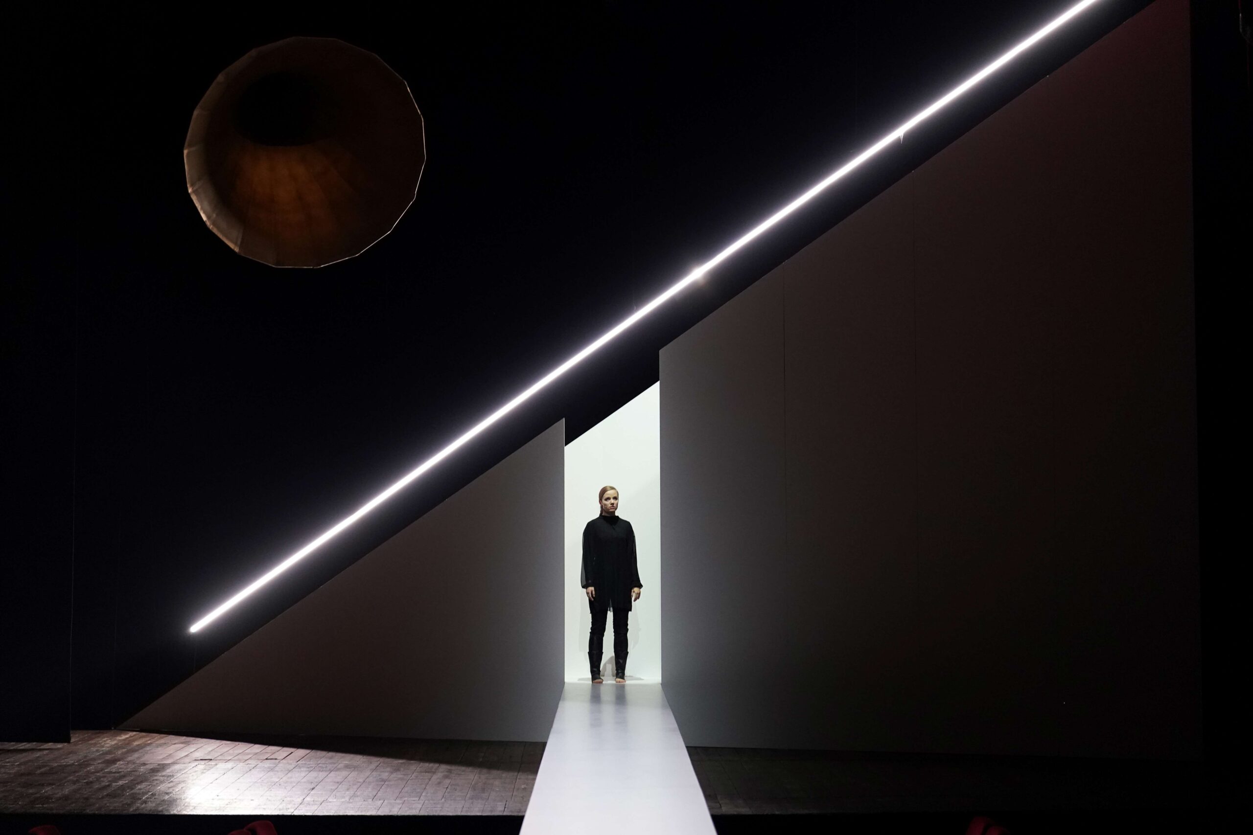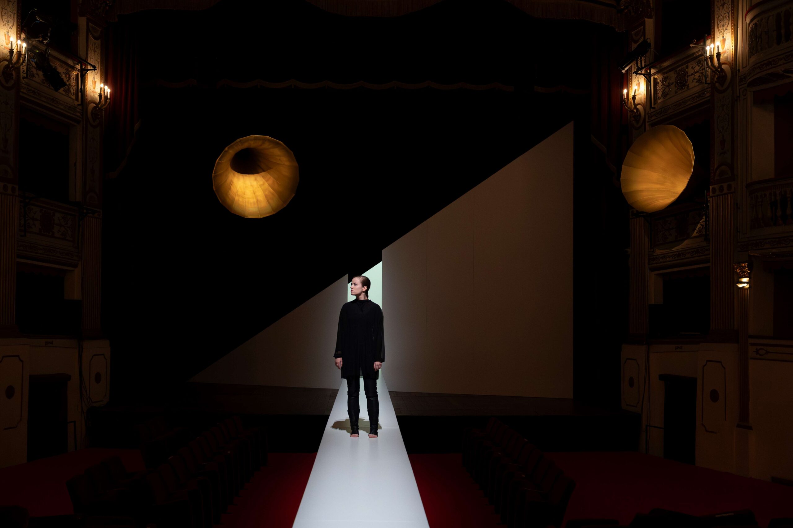 Le voci dei santi (San Michele, Santa Caterina d’Alessandria e Santa Margherita di Antiochia) emergono da grammofoni sparsi sui palchi o che incombono sul palco, come accade per la voce del giudiche Cauchon ed evocano l’eco fantasmagorica che abita il liminale tra realtà e allucinazione, tra luce e ombra, tra presente e memoria. Queste voci, autorevoli eppure anche ironiche e ambigue, non sono presenze fisiche ma sonorità che invadono lo spazio, sottolineando l’isolamento di Giovanna: una donna che ha sfidato il potere maschile, guidando eserciti con la forza della sua fede, ma che ora deve difendersi con preghiere e parole contro un giudice invisibile, simbolo del potere politico.