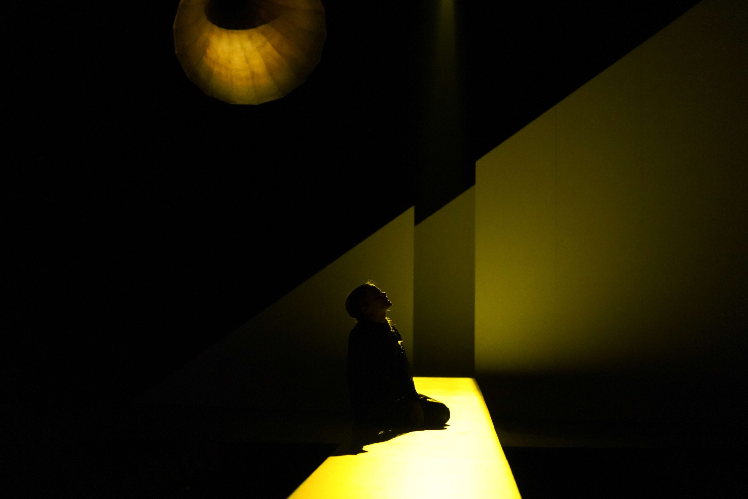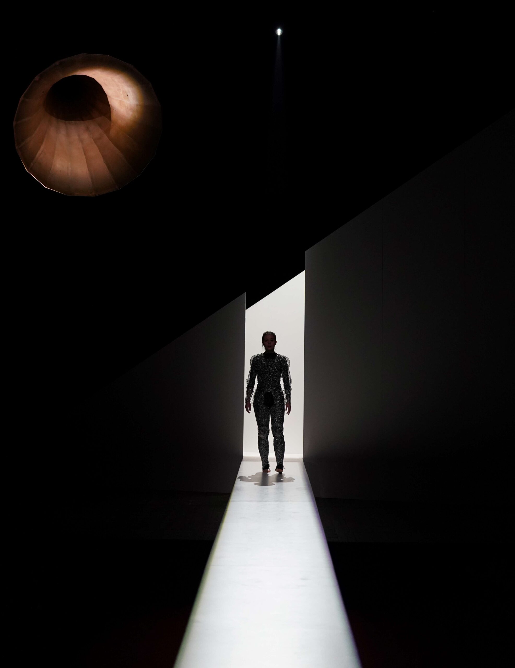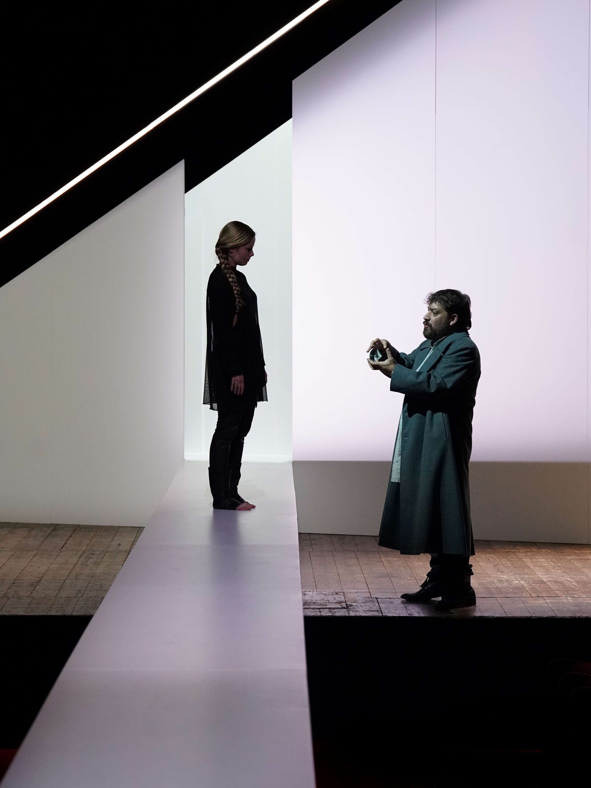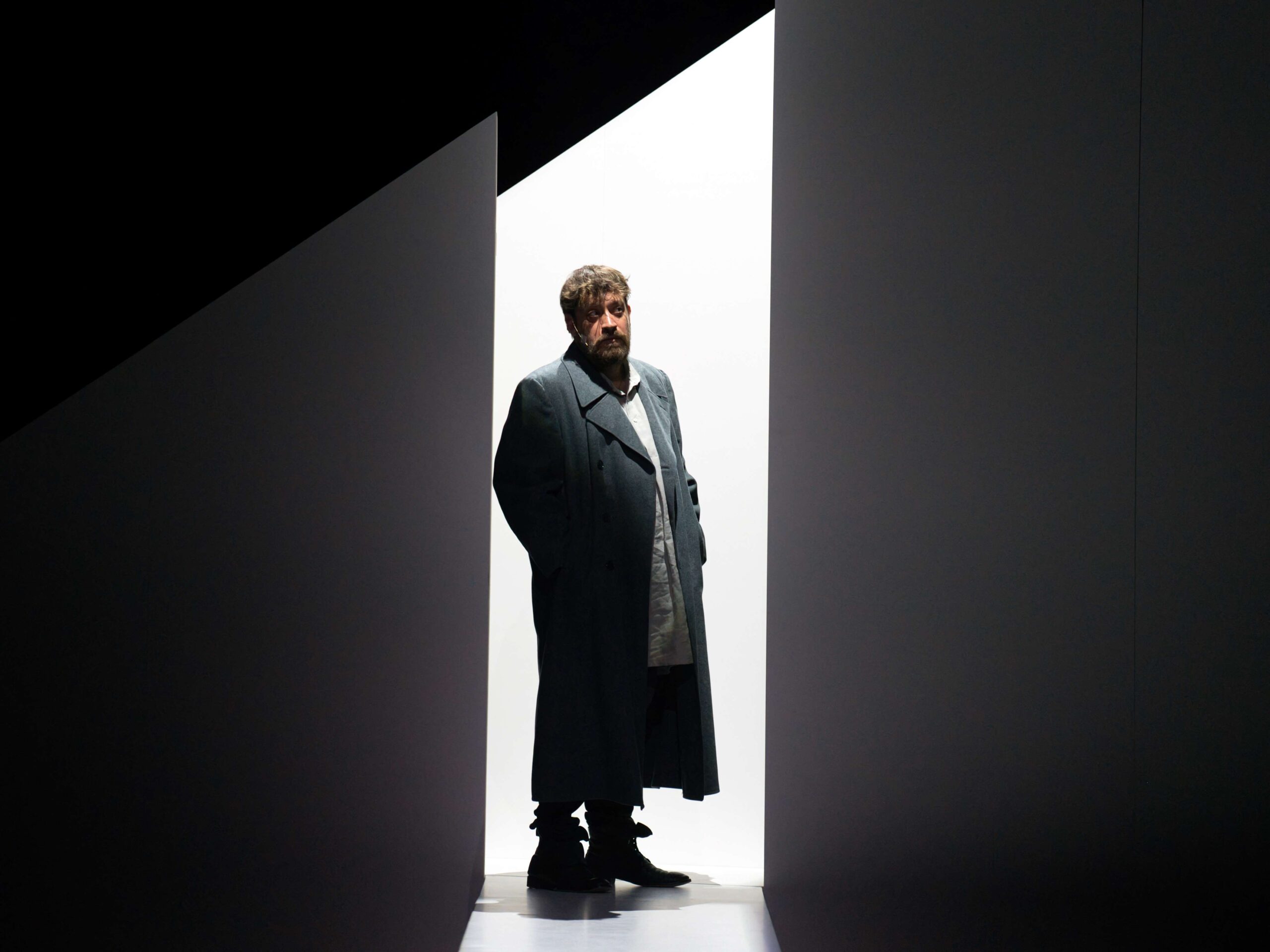 Le voci dei santi (San Michele, Santa Caterina d’Alessandria e Santa Margherita di Antiochia) emergono da grammofoni sparsi sui palchi o che incombono sul palco, come accade per la voce del giudiche Cauchon ed evocano l’eco fantasmagorica che abita il liminale tra realtà e allucinazione, tra luce e ombra, tra presente e memoria. Queste voci, autorevoli eppure anche ironiche e ambigue, non sono presenze fisiche ma sonorità che invadono lo spazio, sottolineando l’isolamento di Giovanna: una donna che ha sfidato il potere maschile, guidando eserciti con la forza della sua fede, ma che ora deve difendersi con preghiere e parole contro un giudice invisibile, simbolo del potere politico.