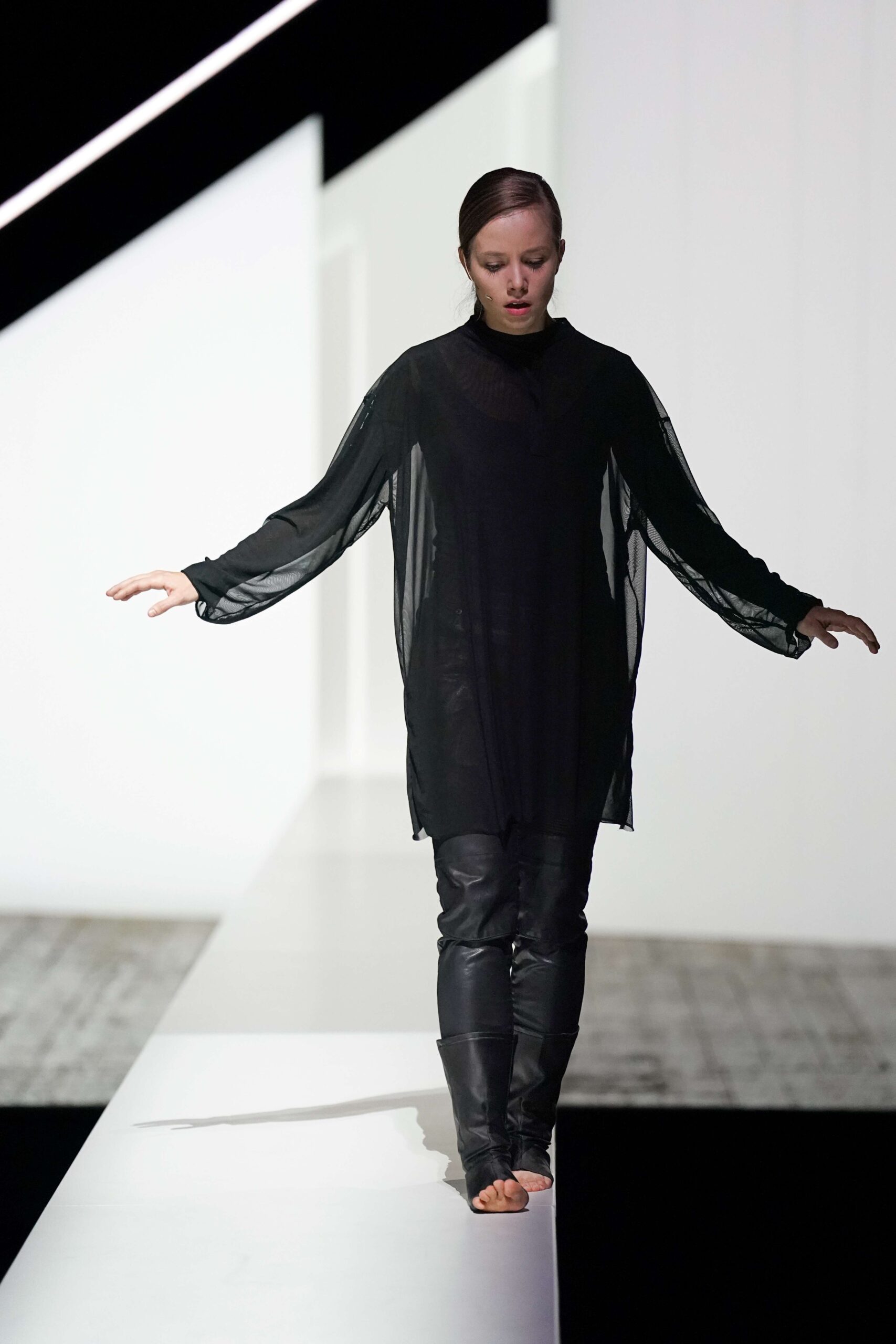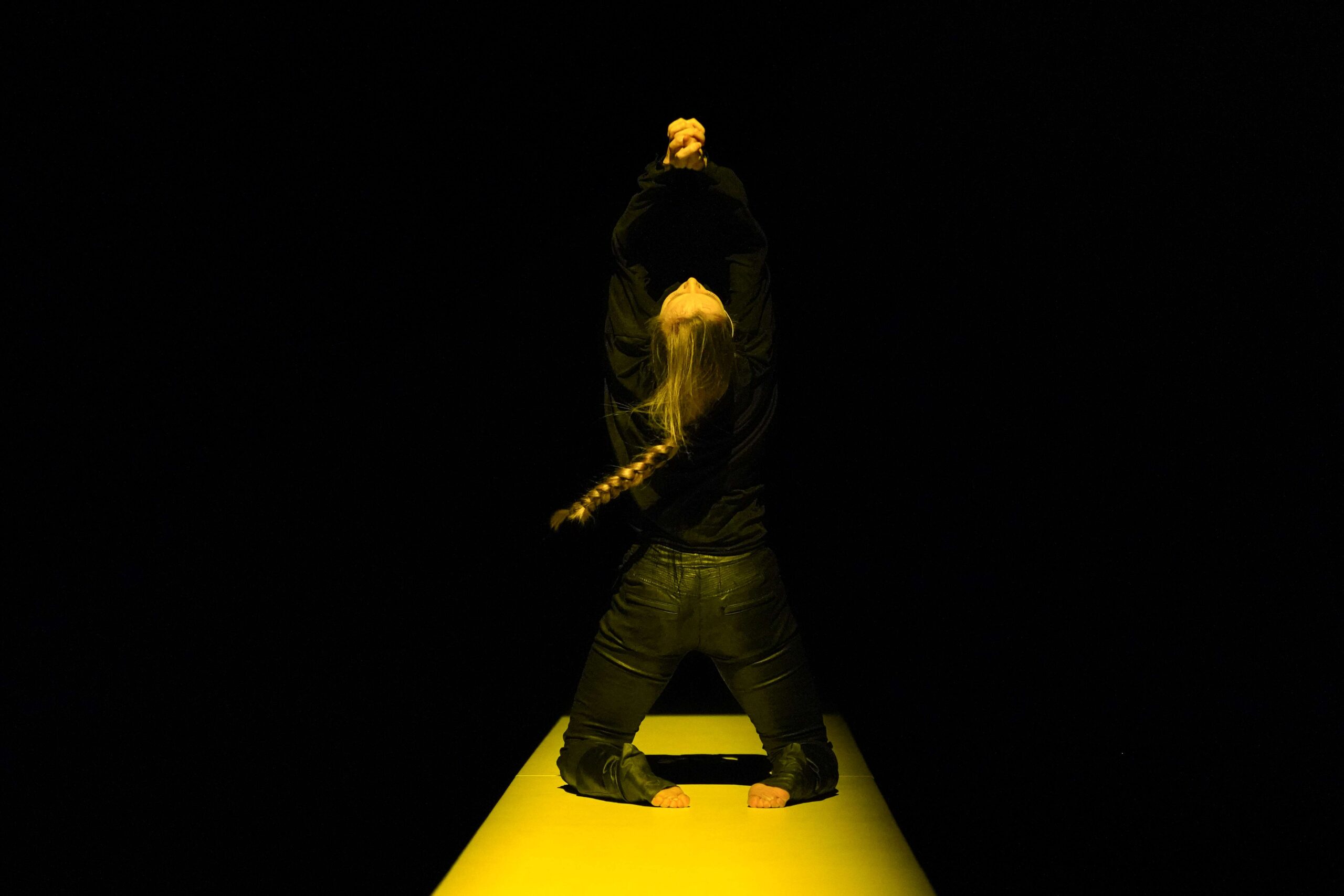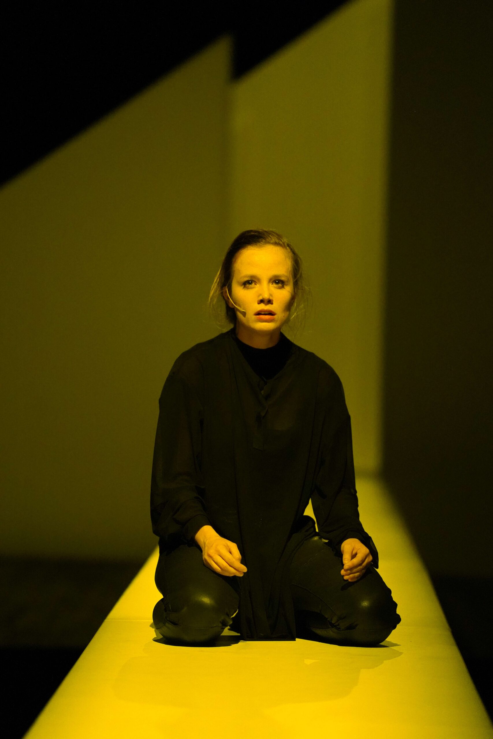 La scena ruota attorno al concetto di prossimità e osservazione. Grazie a una passerella che attraversa lo spazio scenico, il pubblico è vicino a Giovanna, può scrutarla, quasi come un visitatore che esamini un’opera d’arte controversa. Questo dispositivo amplifica il peso dello sguardo accusatorio, trasformando gli spettatori in una giuria di tribunale. Siamo tutti accusatori di qualcun altro, ansiosi di una condanna, desiderosi di vedere l’altro bruciare. Il pubblico diventa così complice, parte integrante del meccanismo di giudizio.