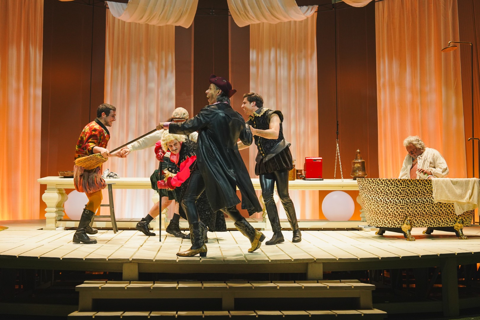 La compagnia teatrale sarà interamente costituita da uomini, e questo non soltanto per un chiaro riferimento alla storica tradizione elisabettiana, ma anche come strumento stilistico per ricondurre lo spettacolo sui toni della farsa e della parodia, tipico del teatro popolare che spesso, anche prima dell’epoca elisabettiana, affidava ruoli femminili a personaggi en travesti; prassi che ci riporta al teatro più contemporaneo del varietà o del Kabaret tedesco di epoca brechtiana.