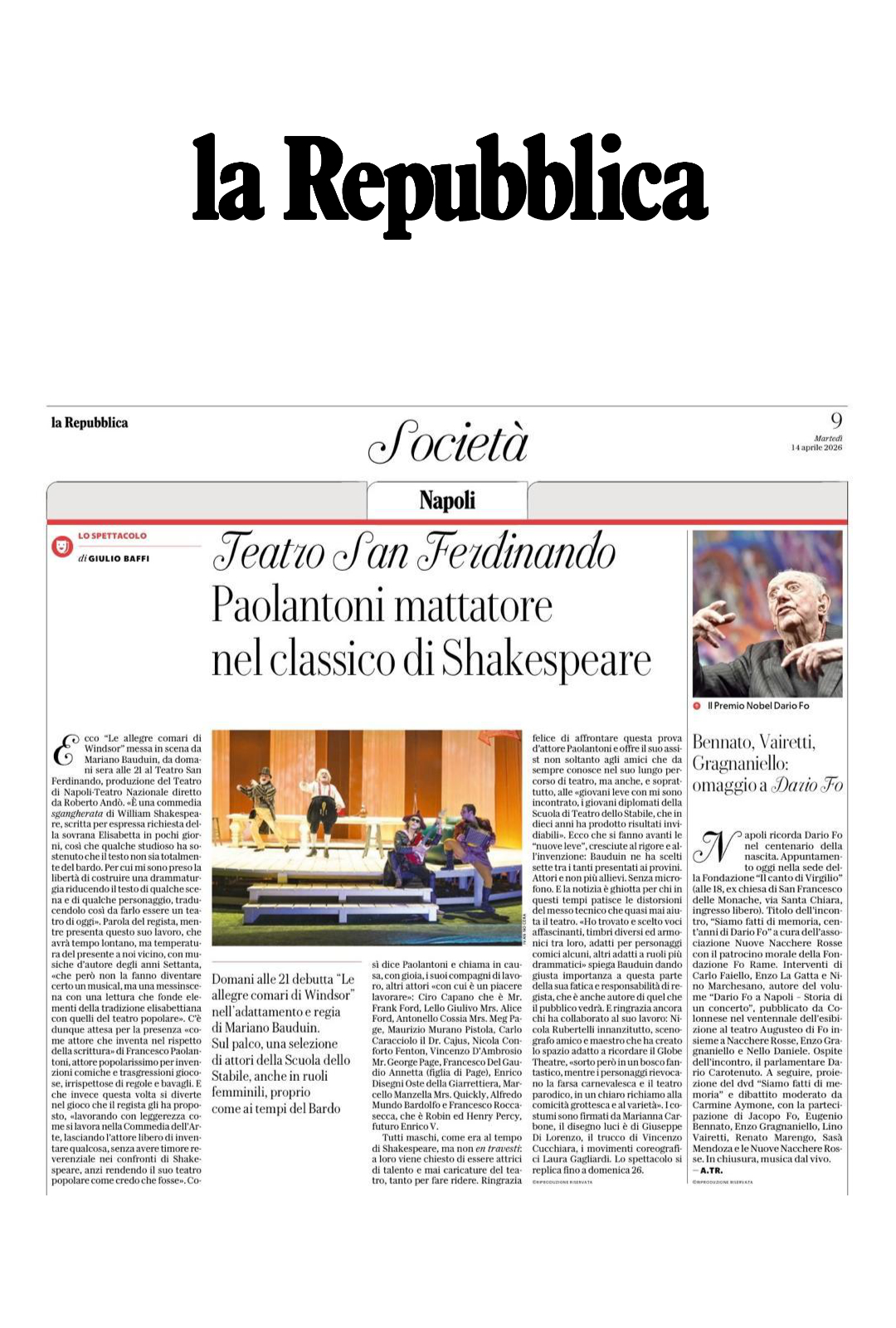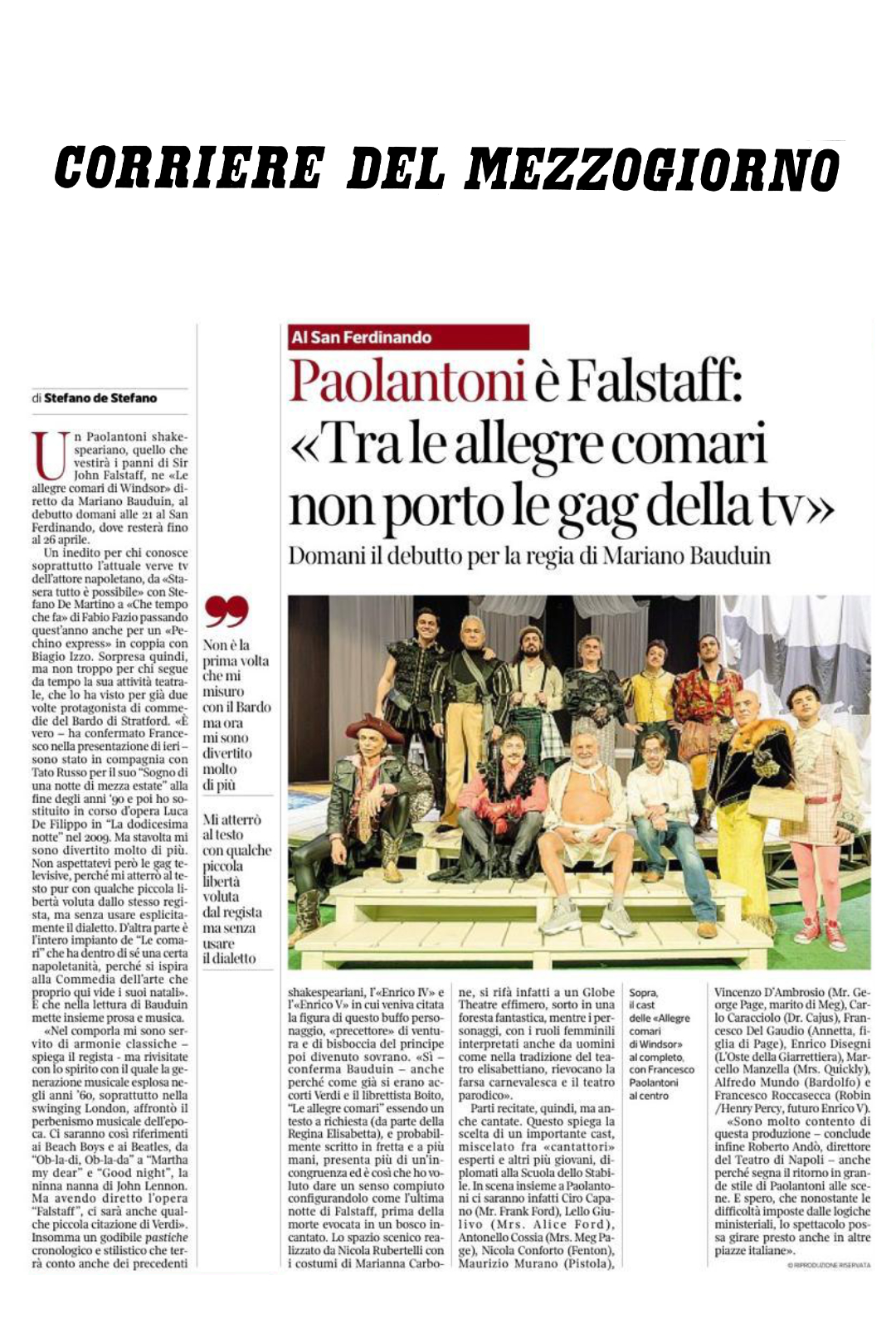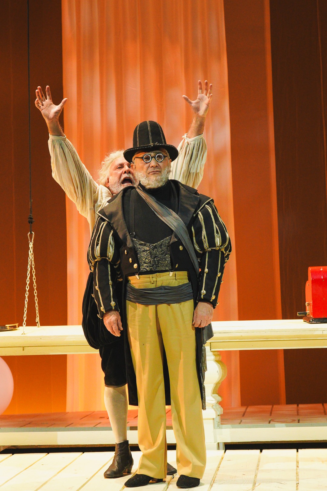 Quello che ho voluto attivare con questa produzione è una lettura drammaturgica e registica che tenesse conto di alcuni tra questi elementi: lo spazio scenico è infatti un immaginario palcoscenico elisabettiano che sorge in un bosco della fantasia, le pareti delineano la geometria del Globe Theatre con inconsistente seta, come se il Globe Theatre fosse apparso come il castello di Merlino nelle gesta di Artù, dalle nuvole; i personaggi, come vecchi comici, recitano la commedia attivando antichi schemi da farsa carnevalesca, o rappresentazione popolare, il tutto in uno stile ottenuto dalla fusione delle linee tardo cinquecentesche e da quelle novecentesche; lo stesso dicasi per i costumi che riprendono linee di stile Cinque e Seicentesco per completarsi in inneschi di abiti alla moda Anni ’60 “Swinging London”. La motivazione di tale contaminazione risiede nel bisogno di mettere l’accento sulla vera chiave di lettura del testo, cioè la fortissima satira alla società ben pensante e moralista contro cui Jhon Falstaff si trova a fare i conti, proprio come nella Londra degli Anni ‘60 i Beatles, e i gruppi della beat generation volevano ribaltare il mondo thatcheriano.