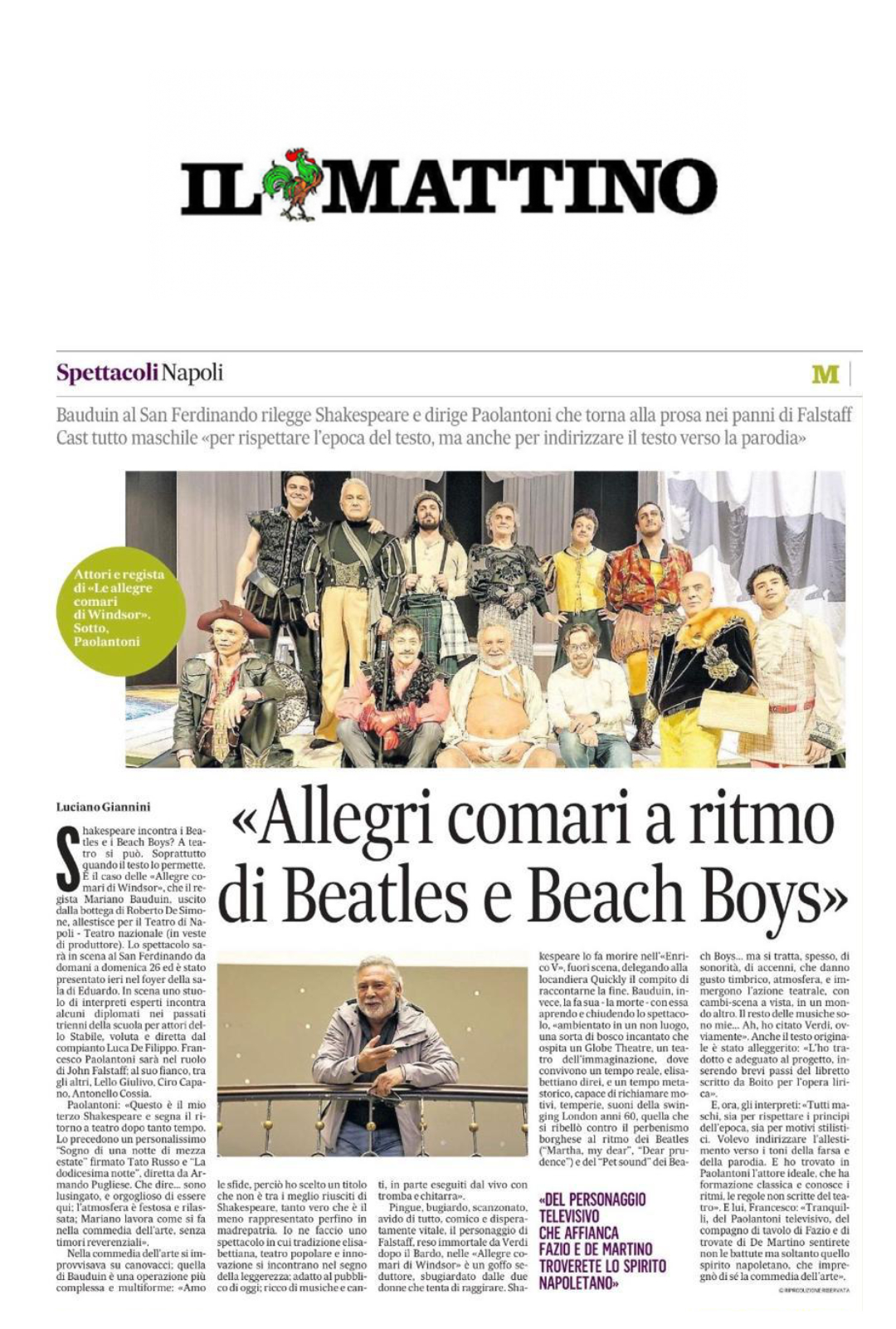 Un ultimo appunto riguarda il progetto musicale, a cui ho affidato un ruolo molto importante; qualcuno in passato ha considerato “Le Allegre comari di Windsor” una commedia minore di Shakespeare, definendone il solo merito di aver fornito Giuseppe Verdi e Arrigo Boito del materiale per comporre una delle Opere liriche più importanti al mondo; io ho avuto la fortuna di allestirlo e ho ritenuto importante usarne alcuni materiali, ma travestendoli e contaminandoli con il gusto che la muscia pop stava accendendo in quei meraviglio Anni ’60; mi riferisco non solo ai Beatles ma anche ai Beach Boys e tutto quel movimento che partiva da “Camden Market”. Laddove a Londra si prese a reinventare la musica colta, usando strumenti classici come il Clavicembalo, le cornette, i corni da caccia e tutti quei modelli provenienti dall’Opera barocca di stile händeliano, mi sono servito di quelle medesime armonie e di quelle idee per comporre brani che potessero raccontare la sfacciataggine di una generazione che sapeva ridere del perbenismo musicale facendone uso, senza rifiutarlo o rinnegarlo, ma approfondendone le possibili trasformazioni e travestimenti, appunto come quello che succede sulla scena. Alcuni brani originali si riferiscono a Ballate, a forme di Gagliarda, di Charleston, ma anche alla stessa composizione verdiana; un po’ come se Giuseppe Verdi diventasse “Joseph The Greens”. In fondo, egli stesso conclude la sua opera con il gran fugato: Tutto nel mondo è burla.