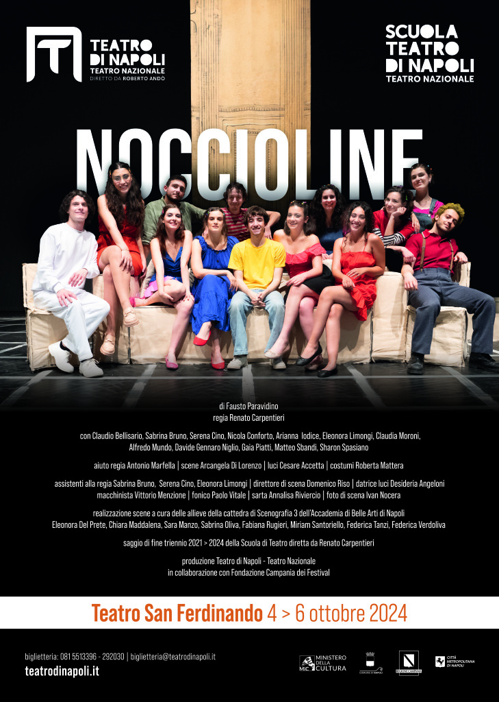 Il triennio 2021-2024 della Scuola del Teatro Nazionale di Napoli, diretta da Renato Carpentieri, è giunto alla sua conclusione. Per l’occasione, gli allievi, sotto la guida registica del loro direttore, hanno portato in scena Noccioline che Fausto Paravidino scrisse nel 2001 a soli 25 anni su commissione del Royal National Theatre di Londra. Ritorna al San Ferdinando con tre repliche straordinarie in occasione della nostra anteprima di stagione dedicata ai giovani artisti e alle scuole di formazione teatrale.