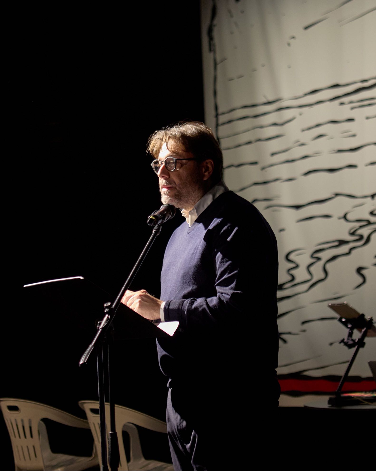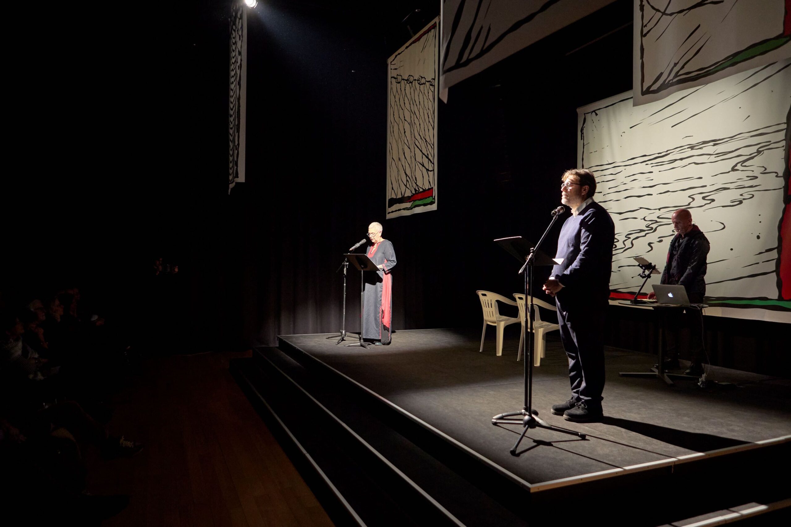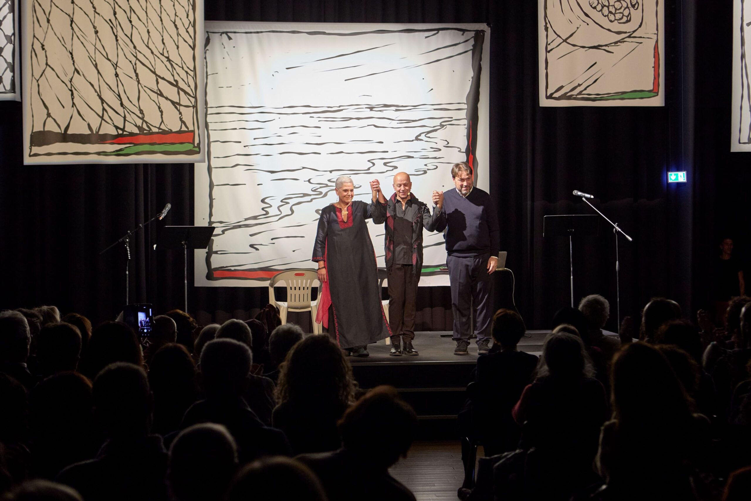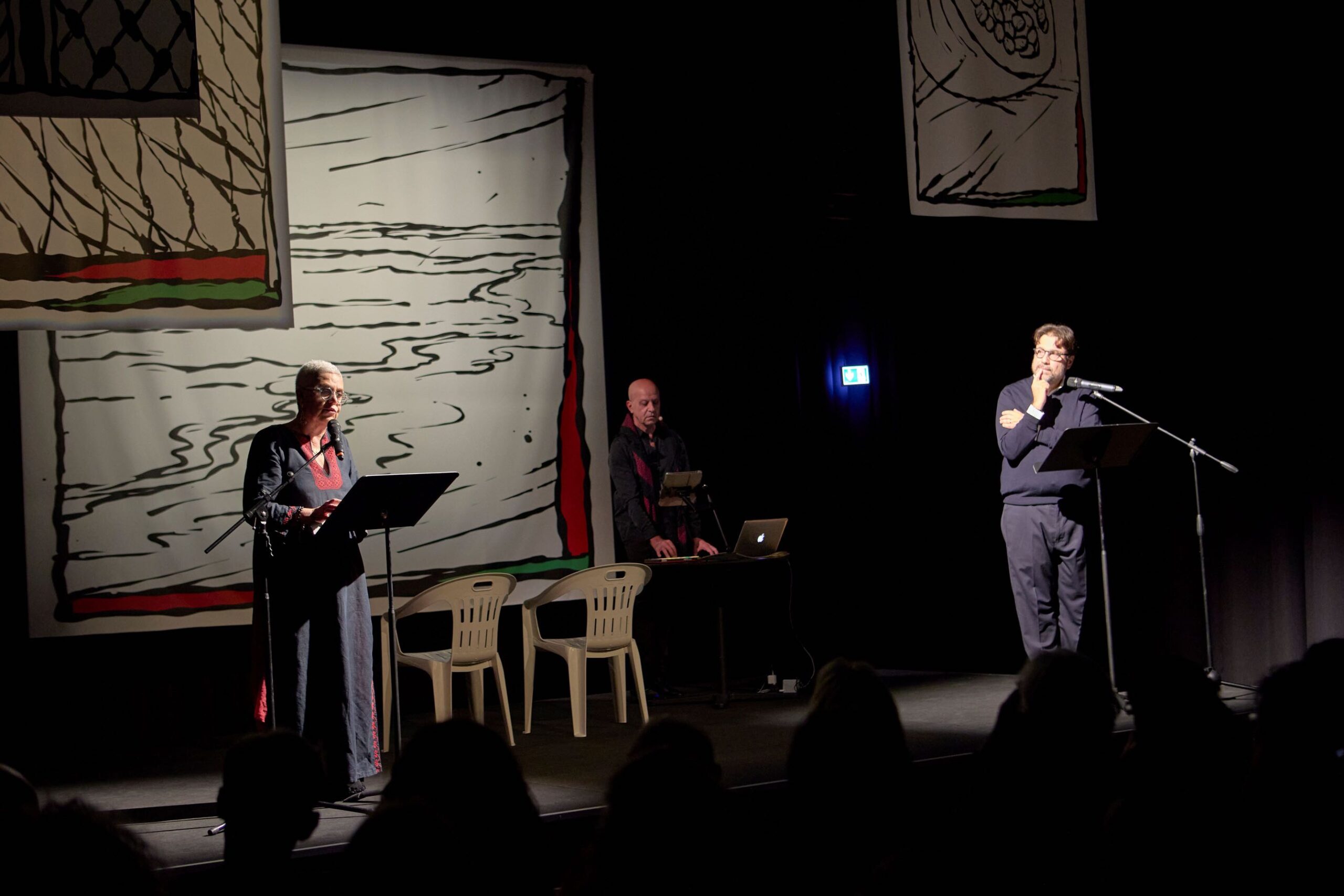 La musica e la voce di Nabil Bey Salameh legano al dialogo i suoni e lo spirito della Palestina. Le immagini di Marco Sauro, che con i suoi disegni ha seguito la campagna di Ultimo Giorno di Gaza, ne costruiscono l’essenzialissima scena.